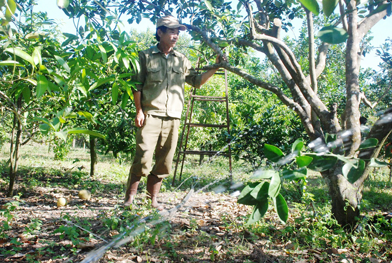 Hệ thống tưới nước tự động được ông Hảo dùng ống nhựa kéo dọc theo hàng cây trồng, 2 hàng một ống tương ứng với mỗi gốc được khoan một lỗ lớn hơn đầu đũa. Mỗi khu vực của từng loại cây trồng là một giếng khoan với hệ thống ống được nối với máy bơm đặt tại giếng. Khi bật điện máy bơm sẽ đẩy nước chạy dọc theo ống. Đầu cuối của mỗi đường ống được lắp van khóa, áp suất sẽ đẩy nước ra các lỗ khoan tưới nhỏ giọt đồng loạt cho các gốc cây. Theo ông Hảo: “Sử dụng hệ thống này rất đơn giản, đầu tư ít nhưng tránh lãng phí nước tối đa so với các hệ thống tự động khác. Vì lượng nước tưới cho mỗi gốc cây với số lượng ít, tưới theo kiểu thẩm thấu; độ chính xác cao, do đó lượng nước tưới cây trồng hấp thụ được nhiều và tiết kiệm điện, nước”. Ông Hảo cho biết thêm: “Trước đây tôi kéo ống tưới cho từng gốc cây, làm như vậy tốn công sức và cần nhiều công lao động, hiệu quả lại không cao. Sau khi tìm hiểu nhiều hệ thống tưới nước tự động, tôi thấy cách làm này phù hợp với điều kiện của mình, nên đầu tư hơn 30 triệu đồng cho 10 ha. Từ đó đến nay, chỉ cần một người đến các điểm bật công tắc điện cho máy bơm chạy, sau đó đi kiểm tra hệ thống ống nước”. Ông Nguyễn Quốc Bảo, Chủ tịch Hội nông dân huyện Lộc Ninh cho biết: Ông Hà Văn Hảo là nông dân sản xuất giỏi, kiên trì và thành công với mô hình trái cây tổng hợp đầu tiên của huyện. Ông Hảo còn là người đầu tiên tìm hiểu, áp dụng hệ thống tưới nước tự động rất đơn giản và hiệu quả. Nhiều nông dân trong huyện đã tham quan và áp dụng để học hỏi làm theo. Công ty Cổ phần Công nghệ tưới Bình Minh.